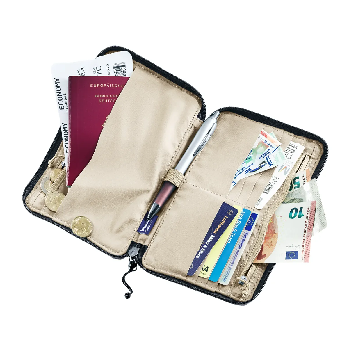 - Bolsillo exterior de rápido acceso para billetes y pasaporte.
