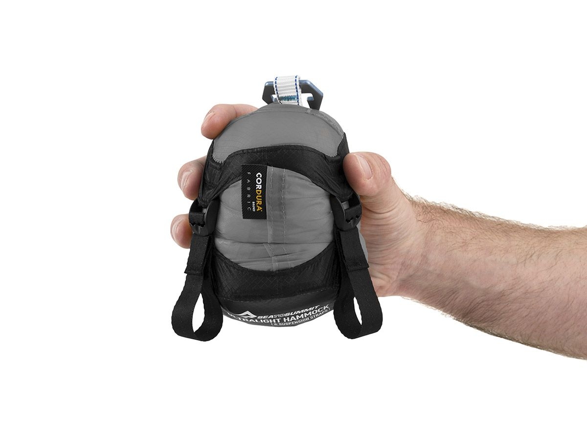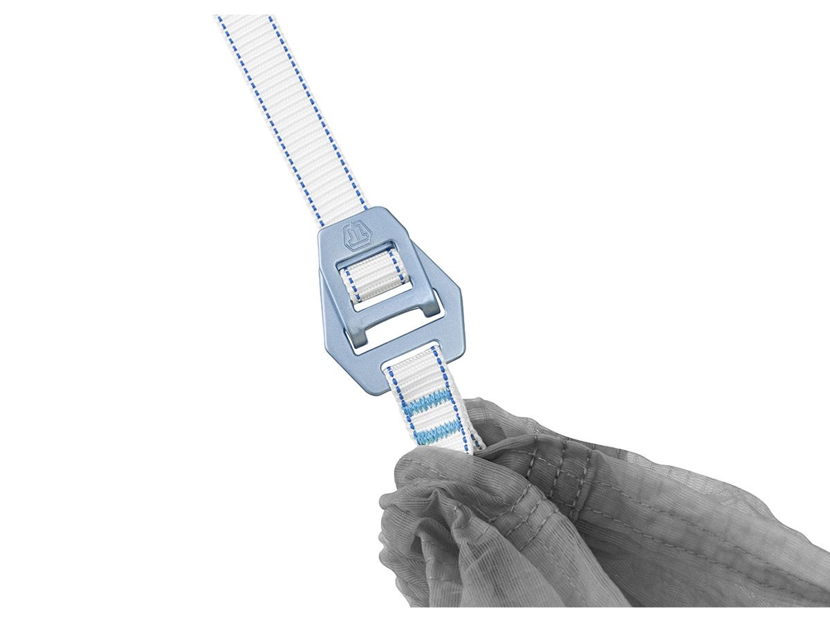 Nuestras hamacas ultraligeras cuentan con un tejido de monofilamento de nylon 20D hecho a medida. Su aspecto susurrante se corresponde con las escalas. Con un peso de 135 kg, la tela es mas que lo suficientemente fuerte como para soportar la carga de una caravana dormida. Al ser un tejido monofilamento, tambien es altamente compresible, lo que hace que el tamano sea minusculo. Las ligeras hebillas de aluminio de la serie 6 de alta resistencia estan conectadas a las hamacas con correas de mezcla de poliester Dyneema no elasticas de 0.8 mm que se pega con barra cinco veces en cada extremo para mayor seguridad.