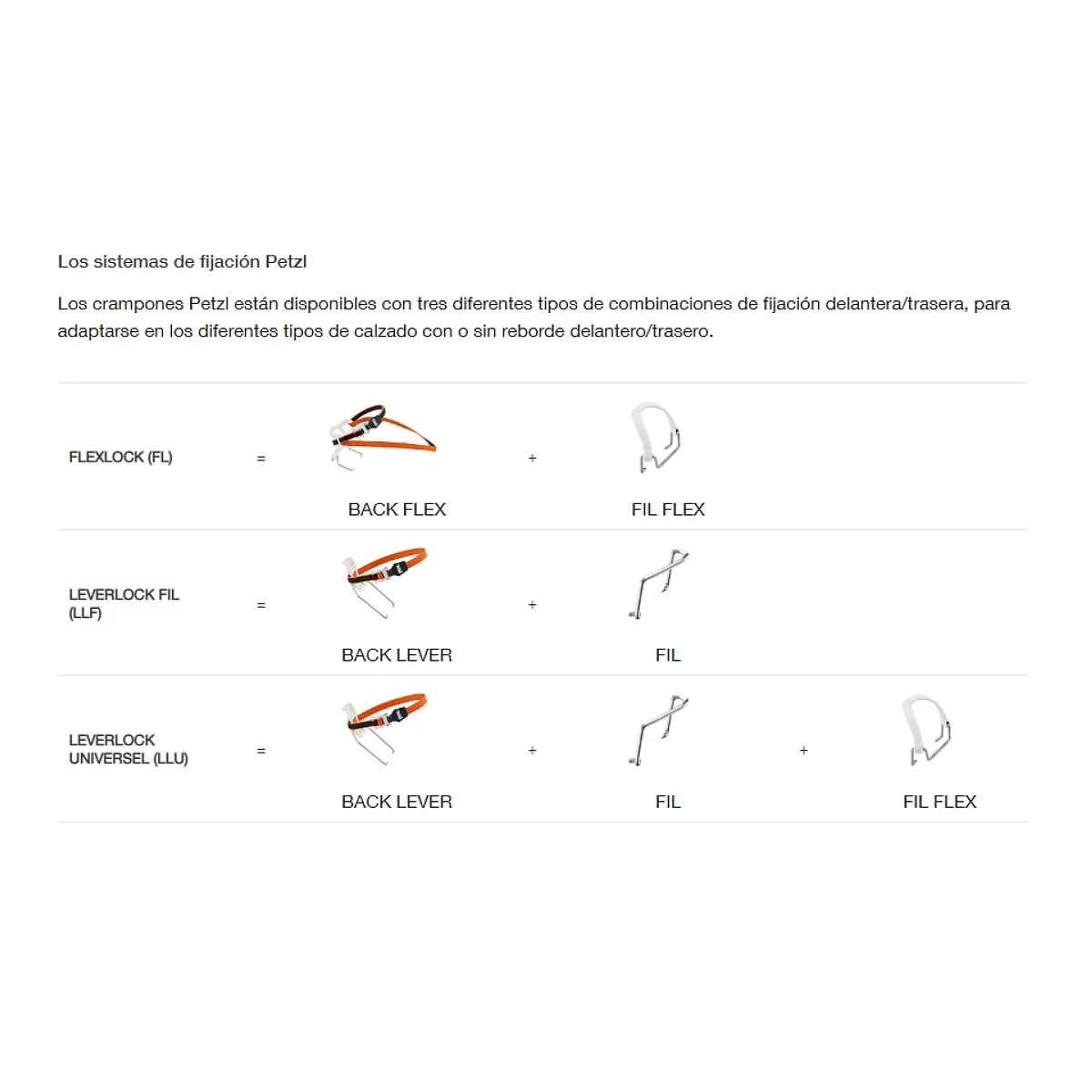 - Disponible en dos sistemas de fijación para adaptarse a cualquier calzado con o sin reborde: LEVERLOCK UNIVERSEL para calzado con reborde trasero, FLEXLOCK para calzado sin rebordes delantero y trasero.