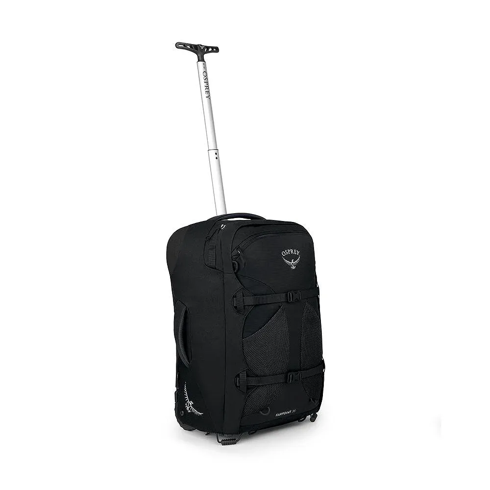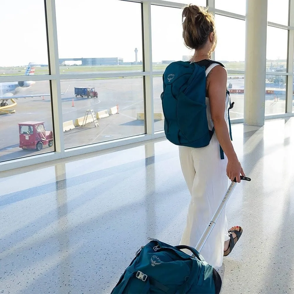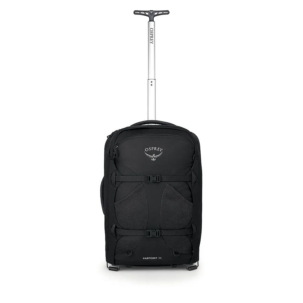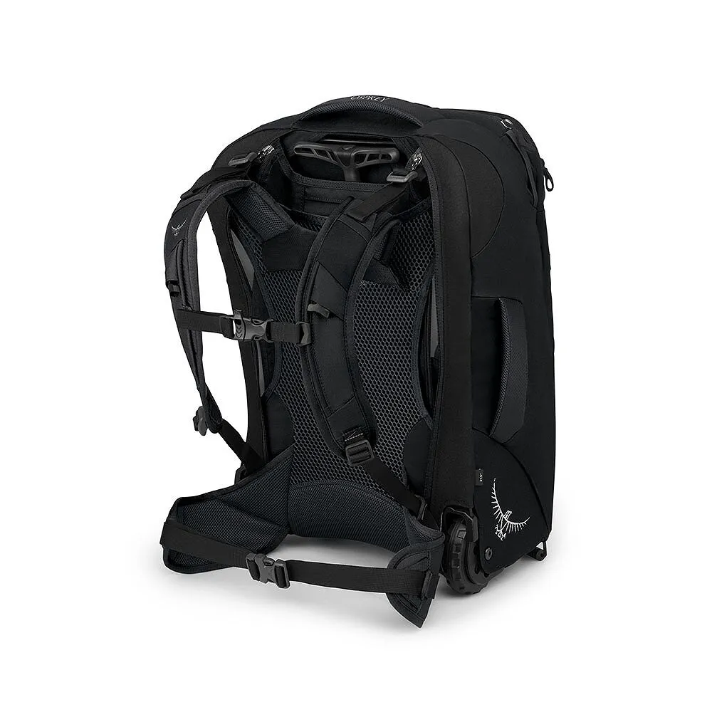 Características Chasis duradero con ruedas de gran tamaño de 90 mm Panel posterior de malla tensada y escamoteable con correas de hombro acolchadas y cinturón lumbar El amplio acceso al panel frontal facilita el embalaje y desembalaje. Bolsillo superior con cremallera en el panel frontal para artículos más pequeños Bolsillos delanteros de malla Correas de compresión Wingjacket frontales dobles Puntos de amarre del panel frontal inferior para fijación de colchoneta para dormir o equipo externo Las asas superiores y laterales acolchadas proporcionan un transporte cómodo. Las correas de compresión internas dobles con alas de tela mantienen la ropa ordenada Bolsillo de malla con cremallera en la pared del bolsillo frontal interior Compatible con presillas de sujeción/puntos de sujeción externos de Farpoint/Fairview Daypack
