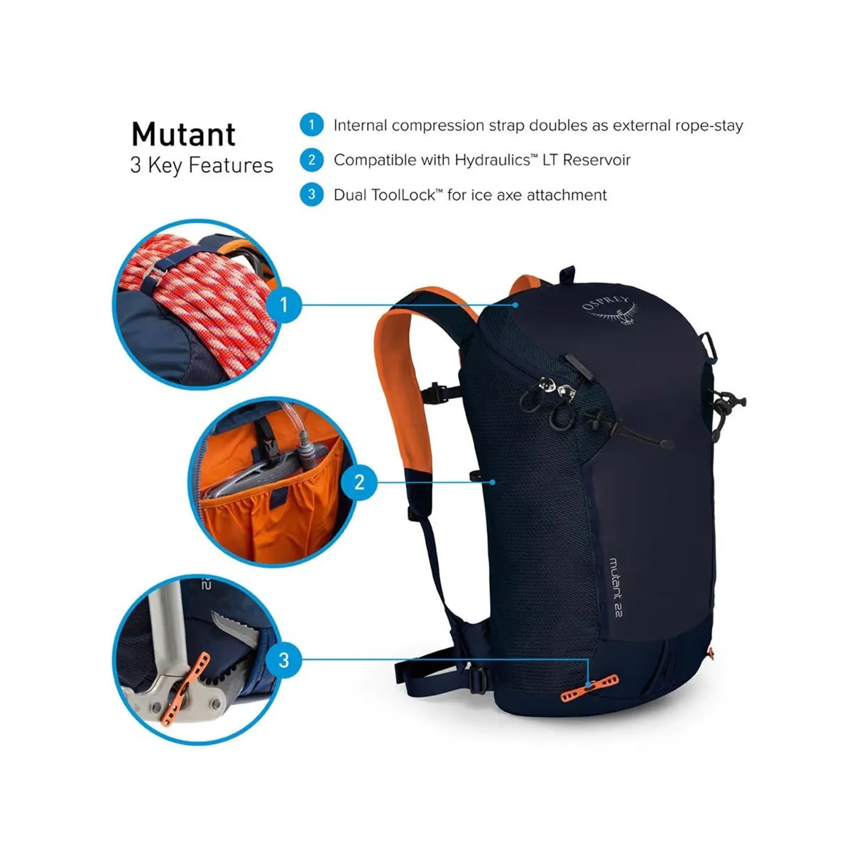 MUTANT 22L Mutant 22 cuenta con transporte de cuerda integrado, una abertura con cremallera de boca ancha, opciones personalizables para llevar crampones / otros. Los artículos en la parte delantera de la mochila y el cinturón lumbar de cincha no se interpondrán en el camino, ya sea que se usen, abrochen detrás de usted o se quiten. Incluye hebillas aptas para guantes, un sistema de transporte de herramientas de hielo seguro y fácil de usar y telas duraderas para garantizar que su mochila pueda durar todo el tiempo que pueda, sin importar su objetivo. Panel trasero de tela Snowshed Cerraduras de herramientas dobles con ataduras elásticas Conexión en cadena del panel frontal para un accesorio de equipo adicional Sistema de transporte de tres puntos Funda de hidratación interna Hebillas aptas para guantes Fijación de cuerda interior / exterior, compresión interna Cinturón lumbar de cincha extraíble Bolsillo de almacenamiento debajo de la gran abertura superior con cremallera para guardar artículos más pequeños con un clip para llaves Lazos laterales para compresión adicional o puntos de sujeción.