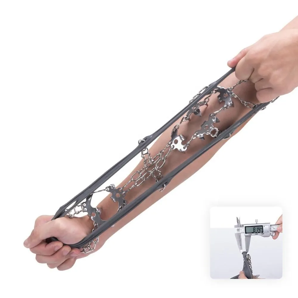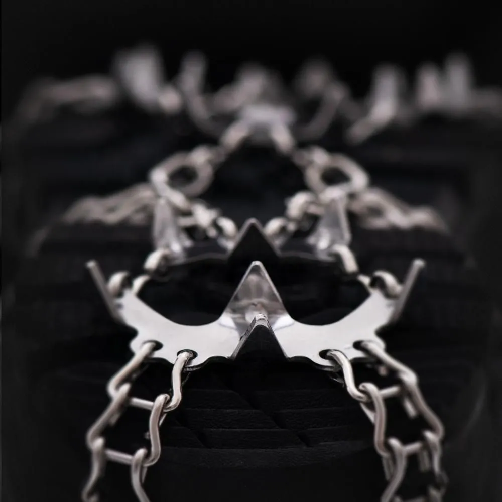 La goma TPE, duradera y flexible, se adapta a los talles de calzado 35-46, envuelve el zapato de forma segura y no resbala al caminar: ideal para senderismo y excursiones por la montaña. Además, una correa de velcro ayuda a mantenerlos en el calzado. Las cadenas de acero han sido sometidas a pruebas de resistencia al calor y a las grietas. Son duraderas y adecuadas para cualquier tipo de superficie.