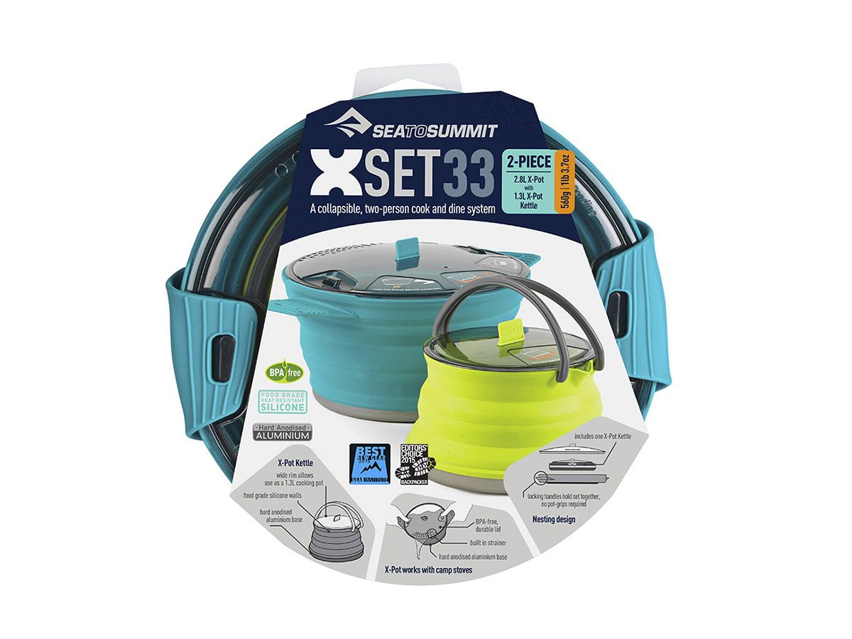 Un sistema de cocción versátil para dos personas. Incluye un X-Pot azul pacífico de 2.8L y un hervidor X-Pot de 1.3L de lima.