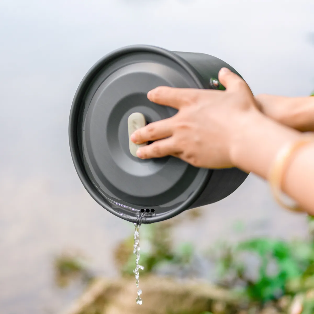Set de cocina completo para actividades al aire libre como camping, trekking, montañismo y otras salidas outdoor. Diseñado para grupos de 4 a 6 personas, permite cocinar en todo tipo de cocinas portátiles. Todos los elementos se encastran entre sí para facilitar el transporte, y se guardan en una bolsa de viaje compacta.